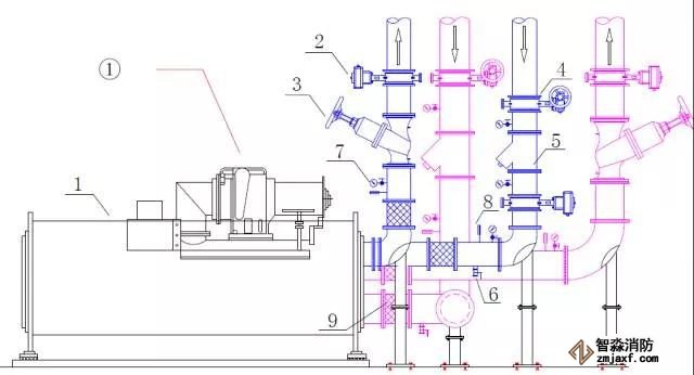 冷水機組常規(guī)接管圖:1-冷水機組,2-電動閥,3-平衡閥,4-蝶閥,5-Y 型過濾器,6-泄水閥,7-壓力表,8-溫度計,9-軟接頭。