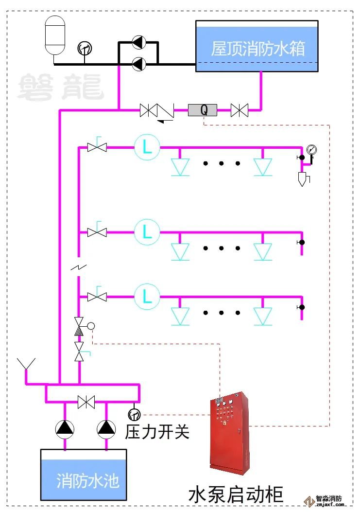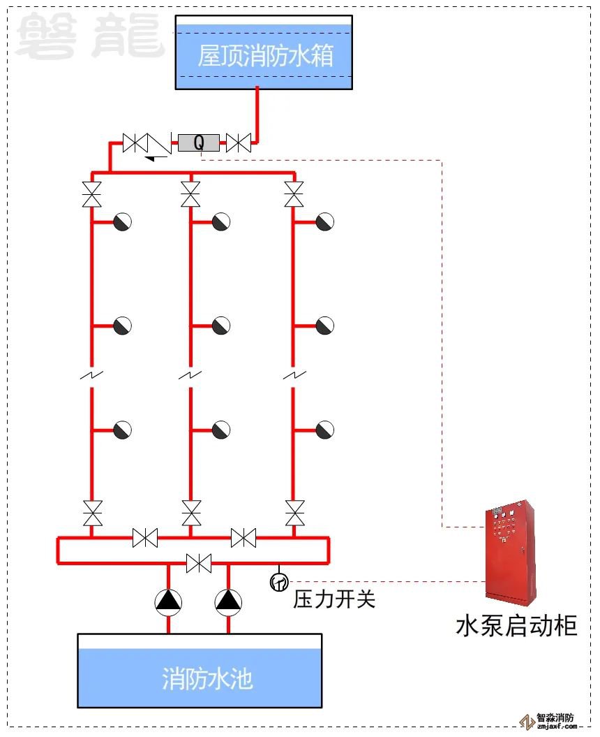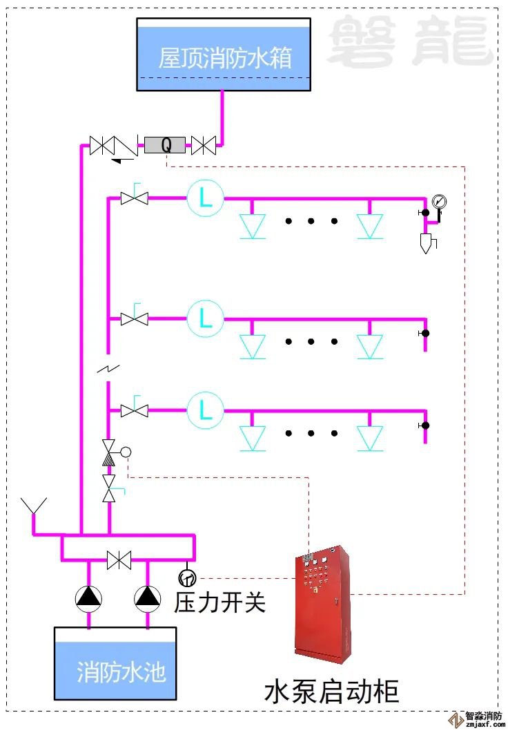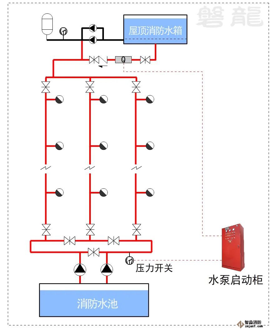 對于這類系統,消防水泵出水干管上應設置壓力開關,高位消防水箱出水管上必須設置流量開關,存在問題及解決措施: