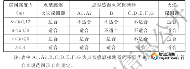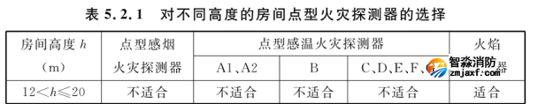 5.2.1 對不同高度的房間,可按表5.2.1選擇點型火災探測器。
