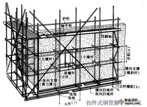 ⒊剪刀撐:四角應設抱角斜撐,四邊設剪刀撐,中間每隔四排立桿沿縱向設一道剪刀撐,斜撐和剪刀撐均應由下而上連續設置。