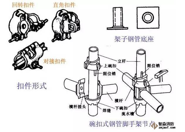 2、利用型鋼擱置在樓層內作為底座(樓面擱置長度大于1.5米,樓層內預埋2道圓鋼錨固型鋼)搭設鋼管腳手架,同時用剛纜斜拉,高度不超過24米或8層。(個人認為也有浪費嫌疑,完全可以通過計算定下型鋼和圓鋼規格,不考慮斜拉。不過安全系數高,可以考慮)