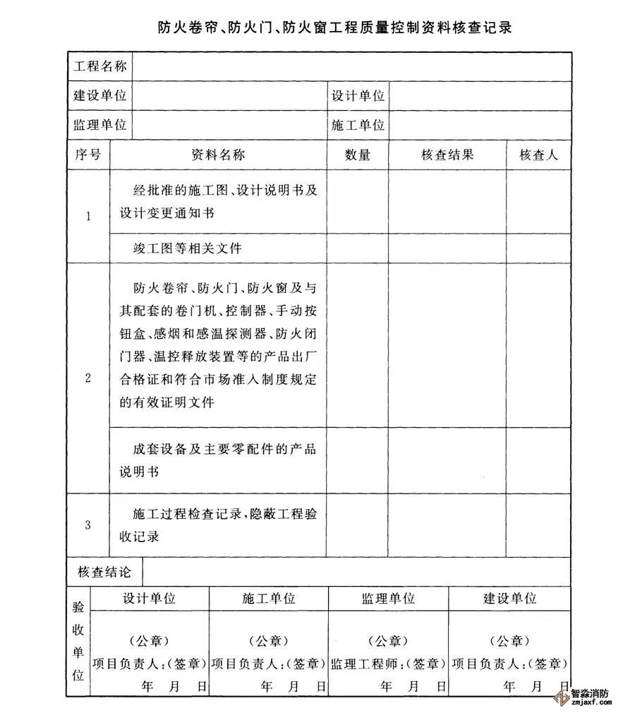 3、防火卷簾、防火門、防火窗工程質(zhì)量驗(yàn)收前,應(yīng)根據(jù)規(guī)范規(guī)定的驗(yàn)收內(nèi)容和驗(yàn)收方法,制訂驗(yàn)收方案,驗(yàn)收人員應(yīng)根據(jù)驗(yàn)收案按程序進(jìn)行,并應(yīng)按規(guī)范填寫工程質(zhì)量驗(yàn)收記錄。