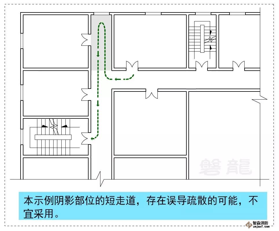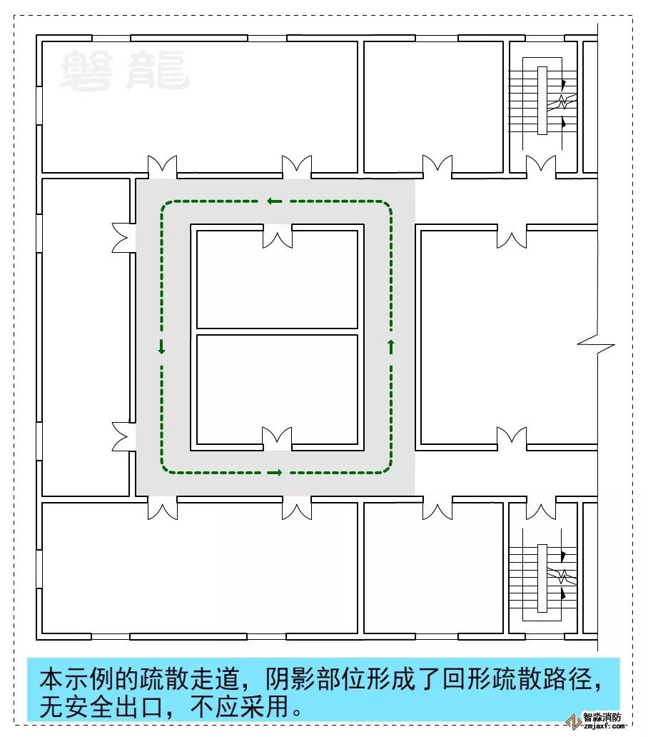 圖示7、圖示8所示的疏散走道,示例部位形成回形疏散路徑,沒(méi)有安全出口,不應(yīng)采用。