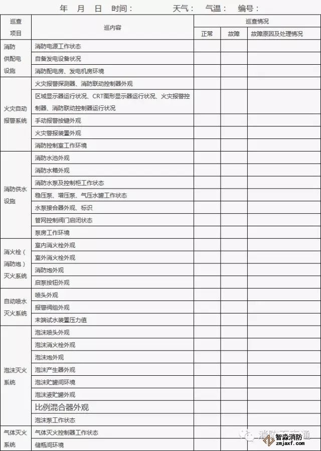 4、附表中各項(xiàng)目情況正常打“√”,存在問題或故障的打“×”;對(duì)發(fā)現(xiàn)的問題應(yīng)及時(shí)處理,當(dāng)場(chǎng)不能處置的要填報(bào)《建筑消防設(shè)施故障處理記錄》。