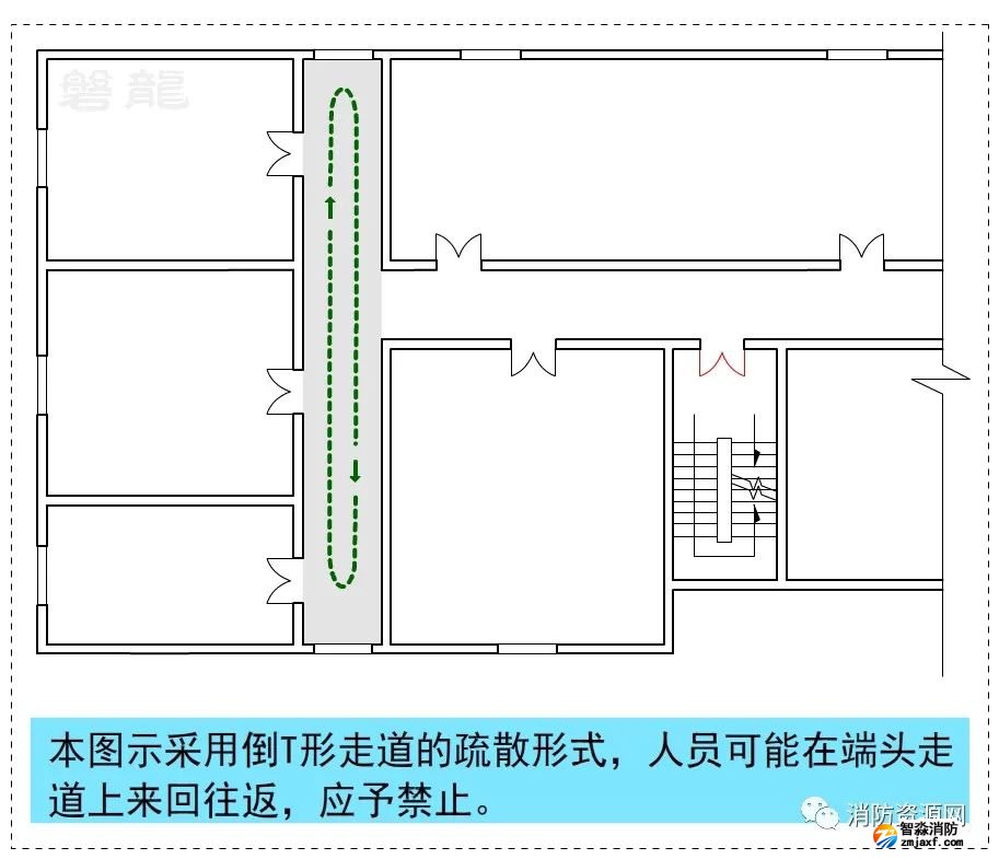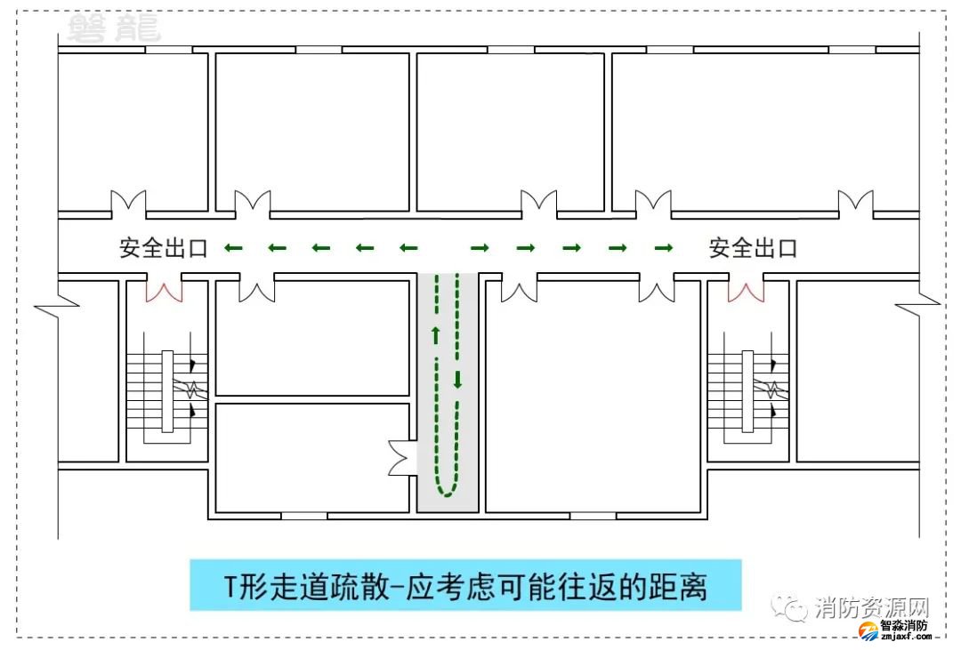 T形走道也稱為丁字形走道,是消防安全疏散設計中不可回避的形式,關于T形疏散走道的疏散距離計算,參專題:T形走道-宜與忌!疏散距離計算規則!