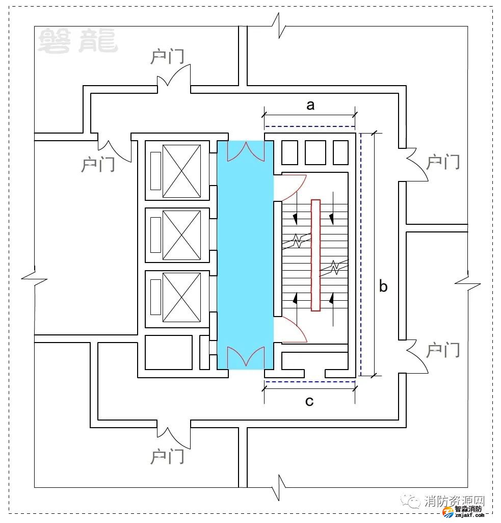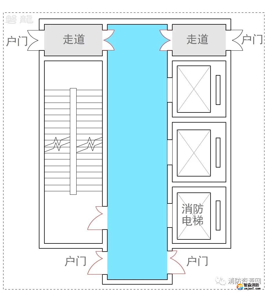 判斷原則:為防止極端方案的出現,我們可以通過取消過道門的方式判斷,如取消過道門后滿足開向同一前室的戶門不大于3樘的要求,那么我們可以認為過道是一種加強性安全措施,否則不應許可!