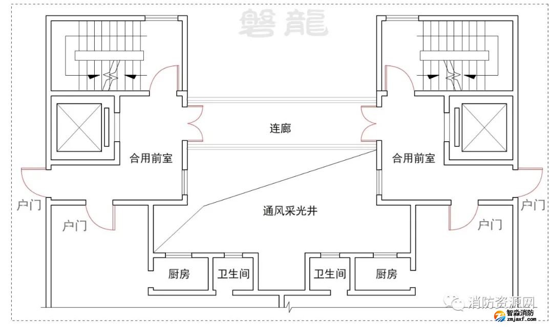 一、滿足一定條件下,擴大前室、擴大封閉樓梯間可設置管井(電井)檢查門和客貨電梯(含公共建筑)。