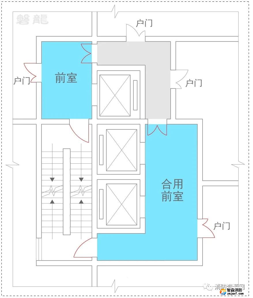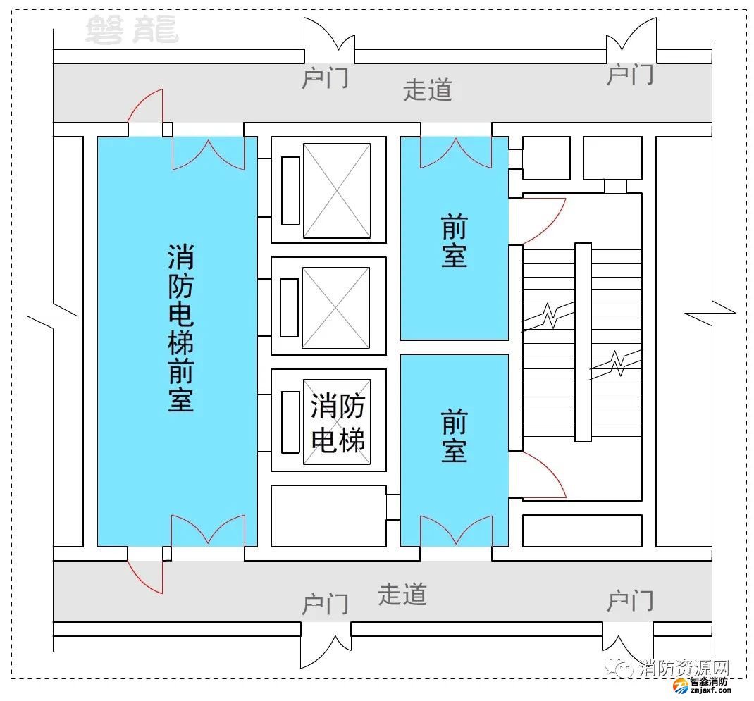 人員可以通過消防電梯前室疏散(比如合用前室的情況),以此為據,穿越獨立的消防電梯前室,在住宅建筑中通常被許可,但公共建筑應予禁止: