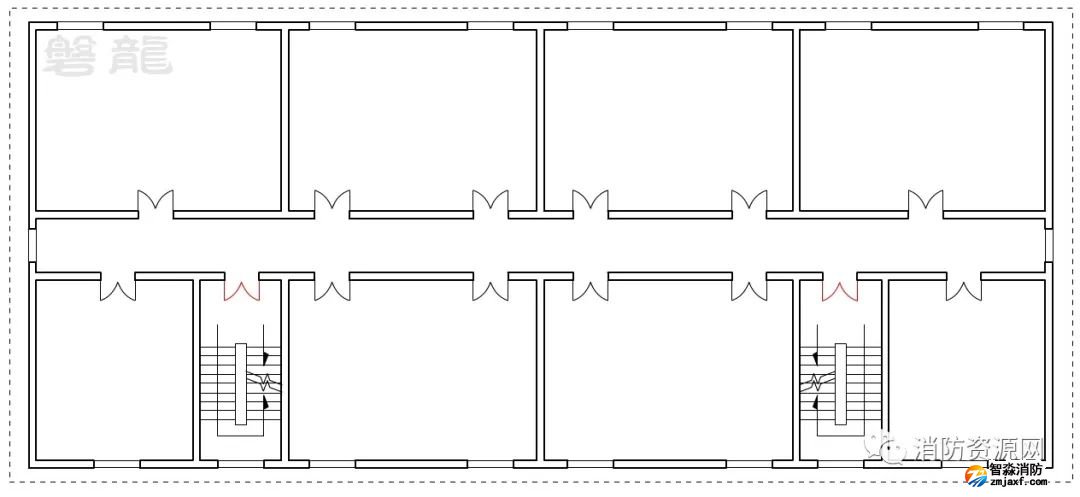 1、正確示例(示例6):本示例的戶門對走道開啟,疏散走道有兩個安全出口,具備雙向疏散功能。
