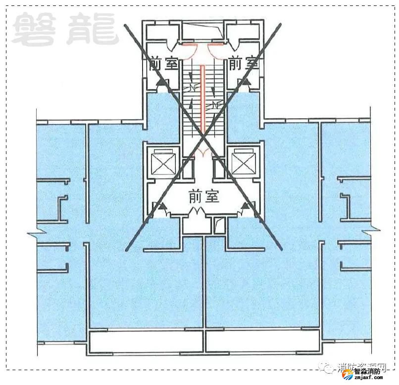 2、錯誤示例(示例23):依前所述,本示例兩個前室的戶門,只有一個安全出口,不應許可。