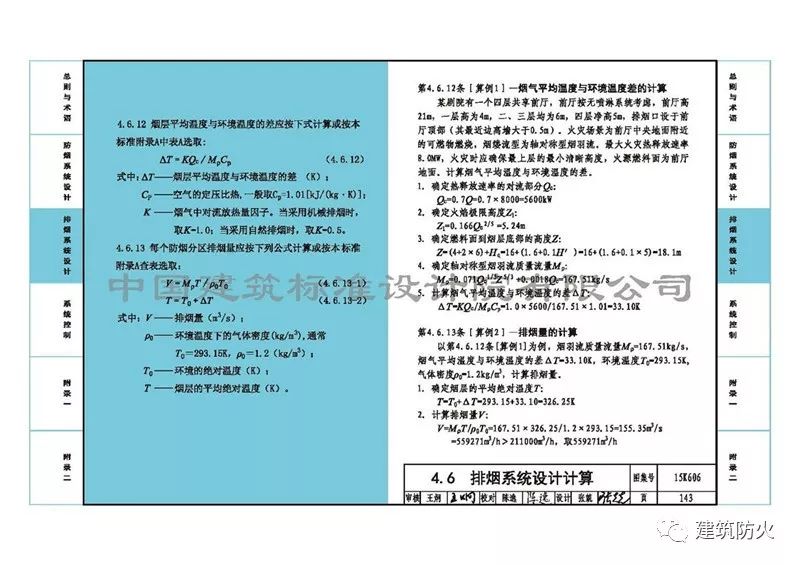 8、第143頁“第4.6.12條[算例1]”:一是字體小了;二是結合《自動噴水滅火系統設計規范》GB50084-2017,將前廳排煙計算從“有噴淋”改為“無噴淋”。