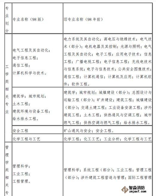 (一)取得消防工程專業大學??茖W歷,工作滿6年,其中從事消防安全技術工作滿4年;或者取得消防工程相關專業(見消防工程相關專業新舊對照表,下同)大學專科學歷,工作滿7年,其中從事消防安全技術工作滿5年。