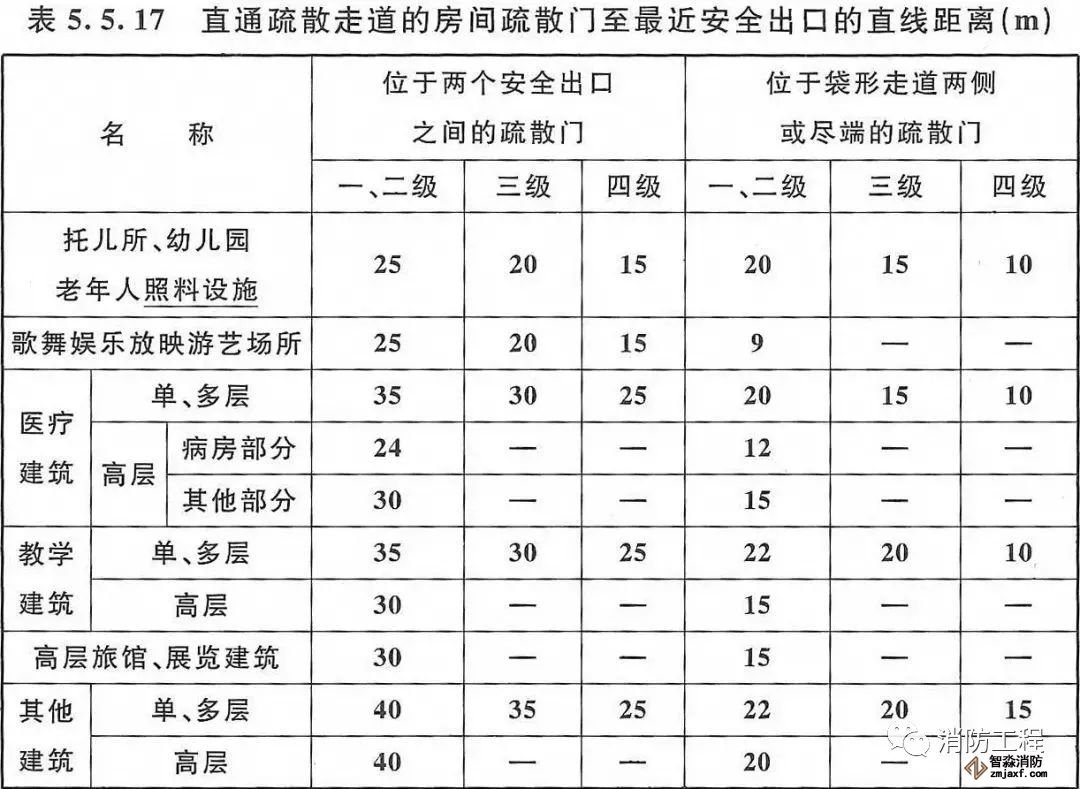 (2)敞開(kāi)樓梯間:兩個(gè)安全出口之間-5m,袋形走道兩側(cè)或盡端-2m;