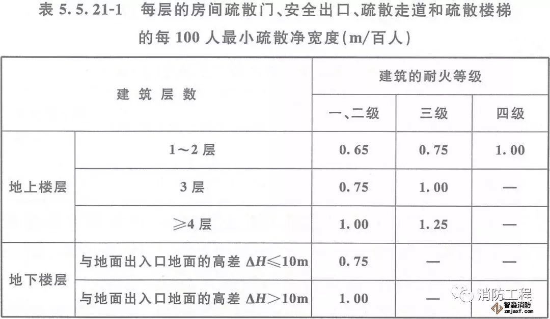 每層的房間疏散門(mén)、安全出口、疏散走道和疏散樓梯的各自總凈寬度,應(yīng)根據(jù)疏散人數(shù)按每100人的最小疏散凈寬度不小于表5.5.21-1的規(guī)定計(jì)算確定。