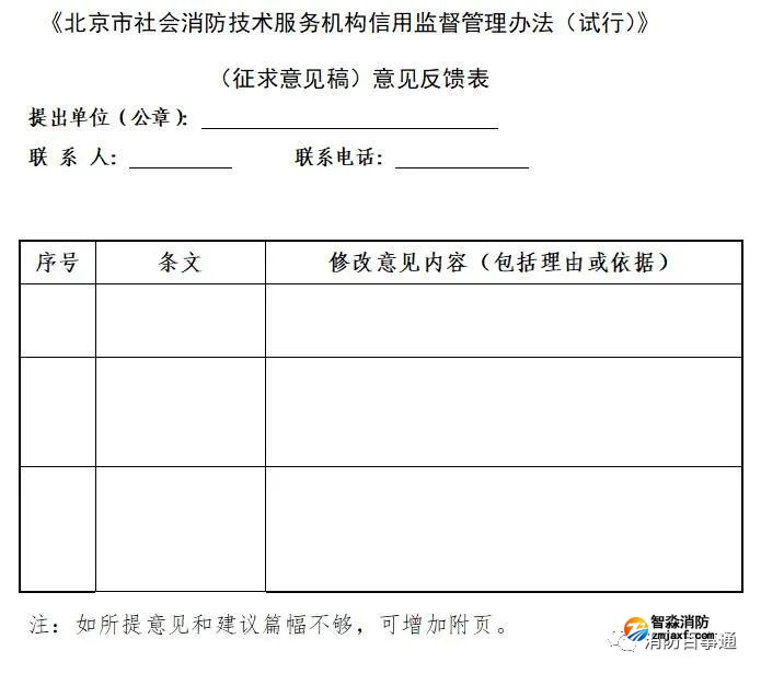 關(guān)于征求《北京市社會消防技術(shù)服務(wù)機構(gòu)信用監(jiān)督管理辦法(試行)》(征求意見稿)意見的通知各消防技術(shù)服務(wù)機構(gòu),各社會單位:為進(jìn)一步優(yōu)化營商環(huán)境,規(guī)范社會消防技術(shù)服務(wù)機構(gòu)市場秩序,增強社會消防技術(shù)服務(wù)市場誠信意識,提高事中事后監(jiān)管效能,北京市消防救援總隊制定了《北京市社會消防技術(shù)服務(wù)機構(gòu)信用監(jiān)督管理辦法(試行)》(見附件1),現(xiàn)向社會公開征求意見。請結(jié)合實際工作認(rèn)真研究,將意見填入“意見反饋表”(見附件2)中,于2022年4月8日前,將加蓋公章的意見反饋表及word版原件發(fā)送至lyq401@163.com。1.《北京市社會消防技術(shù)服務(wù)機構(gòu)信用監(jiān)督管理辦法(試行)》征求意見稿(聯(lián)系人:李永慶;電話:82215169)北京市社會消防技術(shù)服務(wù)機構(gòu)信用監(jiān)督管理辦法(試行)第一條 為進(jìn)一步優(yōu)化營商環(huán)境,規(guī)范社會消防技術(shù)服務(wù)機構(gòu)市場秩序,增強社會消防技術(shù)服務(wù)市場誠信意識,提高事中事后監(jiān)管效能,根據(jù)《關(guān)于深化消防執(zhí)法改革的實施意見》、《社會消防技術(shù)服務(wù)管理規(guī)定》、《北京市優(yōu)化營商環(huán)境條例》等規(guī)定要求,制定本辦法。第二條 北京市消防救援機構(gòu)對本市行政區(qū)域內(nèi)開展消防技術(shù)服務(wù)活動的社會消防技術(shù)服務(wù)機構(gòu)實施信用評價、信用監(jiān)管、信用公示、修復(fù)和信用懲戒等,適用本辦法。第三條 社會消防技術(shù)服務(wù)機構(gòu)應(yīng)當(dāng)依照法律法規(guī)、國家、行業(yè)、地方標(biāo)準(zhǔn)和執(zhí)業(yè)準(zhǔn)則開展技術(shù)服務(wù)活動,并對服務(wù)質(zhì)量負(fù)責(zé)。第四條 倡導(dǎo)和鼓勵社會消防技術(shù)服務(wù)機構(gòu)積極參加公益性消防技術(shù)服務(wù)以及消防救援機構(gòu)組織的重要場所消防服務(wù)保障、消防行政管理輔助活動等。第五條 社會消防技術(shù)服務(wù)機構(gòu)應(yīng)當(dāng)加強誠信建設(shè)和守信教育,健全內(nèi)部誠信制度,提高誠信經(jīng)營水平。第六條 消防技術(shù)服務(wù)機構(gòu)信用等級劃分為優(yōu)(A、A-)、良(B+、B、B-)、中(C+、C、C-)、差(D)四等九級。第七條 消防技術(shù)服務(wù)機構(gòu)信用等級評價采用積分制,分值由基礎(chǔ)分、加分、減分構(gòu)成,基礎(chǔ)分為700分。第八條 消防技術(shù)服務(wù)機構(gòu)信用等級根據(jù)評價周期內(nèi)積分確定:第九條 消防技術(shù)服務(wù)機構(gòu)信用等級評價周期為一個自然年度,每個評價周期初始分值為700分,評價周期屆滿,積分清除,不轉(zhuǎn)入下一個評價周期。首次評價周期為評價標(biāo)準(zhǔn)發(fā)布之日至當(dāng)年12月31日。第十條 在評價周期內(nèi),評價對象在重大火災(zāi)事故、特別重大火災(zāi)事故中負(fù)有主要責(zé)任或被列入消防安全嚴(yán)重失信主體名單的,直接評定為D級并即時調(diào)整公布評價信息。第十一條 消防技術(shù)服務(wù)機構(gòu)信用等級評價結(jié)果在市消防救援總隊相關(guān)網(wǎng)站進(jìn)行公示,公示期滿后,向社會正式公布。第十二條 消防技術(shù)服務(wù)機構(gòu)對信用評價結(jié)果有異議的,可在結(jié)果公示之日起7個工作日內(nèi),向市消防救援總隊提交異議申請。市消防救援總隊自收到異議申請之日起7個工作日內(nèi)給予書面答復(fù)。申請被采納的,對評價結(jié)果進(jìn)行調(diào)整。第十三條 消防技術(shù)服務(wù)機構(gòu)具有下列行為之一的,每項次減100分:(一)不具備從業(yè)條件從事消防技術(shù)服務(wù)活動的;(三)冒用其他消防技術(shù)服務(wù)機構(gòu)名義從事社會消防技術(shù)服務(wù)活動的;(四)無健全的質(zhì)量管理體系或消防安全評估過程控制體系的;(五)經(jīng)火災(zāi)事故調(diào)查認(rèn)定,對亡人或重大社會影響的火災(zāi)事故負(fù)有主要責(zé)任的;(七)向消防救援機構(gòu)提供虛假證明材料的。第十四條 消防技術(shù)服務(wù)機構(gòu)具有下列行為之一的,每項次減50分:(一)出具的書面結(jié)論文件未簽名、蓋章的;(二)所屬注冊消防工程師同時在兩個以上消防技術(shù)服務(wù)機構(gòu)執(zhí)業(yè)或在其他機關(guān)、團體、企業(yè)、事業(yè)單位任職的;(三)指派無相應(yīng)資格從業(yè)人員從事社會消防技術(shù)服務(wù)活動的;(四)消防設(shè)施維護(hù)保養(yǎng)檢測機構(gòu)的項目負(fù)責(zé)人或者消防設(shè)施操作員未到現(xiàn)場實地開展工作的;(五)轉(zhuǎn)包、分包消防技術(shù)服務(wù)項目的;(六)未按照國家、行業(yè)、地方標(biāo)準(zhǔn)開展檢測、維護(hù)保養(yǎng)、評估的。第十五條 消防技術(shù)服務(wù)機構(gòu)具有下列行為之一的,每項次減25分:(一)未設(shè)立技術(shù)負(fù)責(zé)人、明確項目負(fù)責(zé)人的;(二)未依法與委托人簽訂消防技術(shù)服務(wù)合同的;(三)未建立和保管消防技術(shù)服務(wù)檔案的;(四)未在經(jīng)營場所公示營業(yè)執(zhí)照、工作程序、收費標(biāo)準(zhǔn)、從業(yè)守則、注冊消防工程師注冊證書、投訴電話等事項的;(五)未在經(jīng)其維護(hù)保養(yǎng)的消防