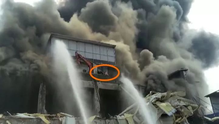 廠房頂部一架挖機上兩名施工人員被困樓頂,消防人員進入火場,對被困人員進行施救。