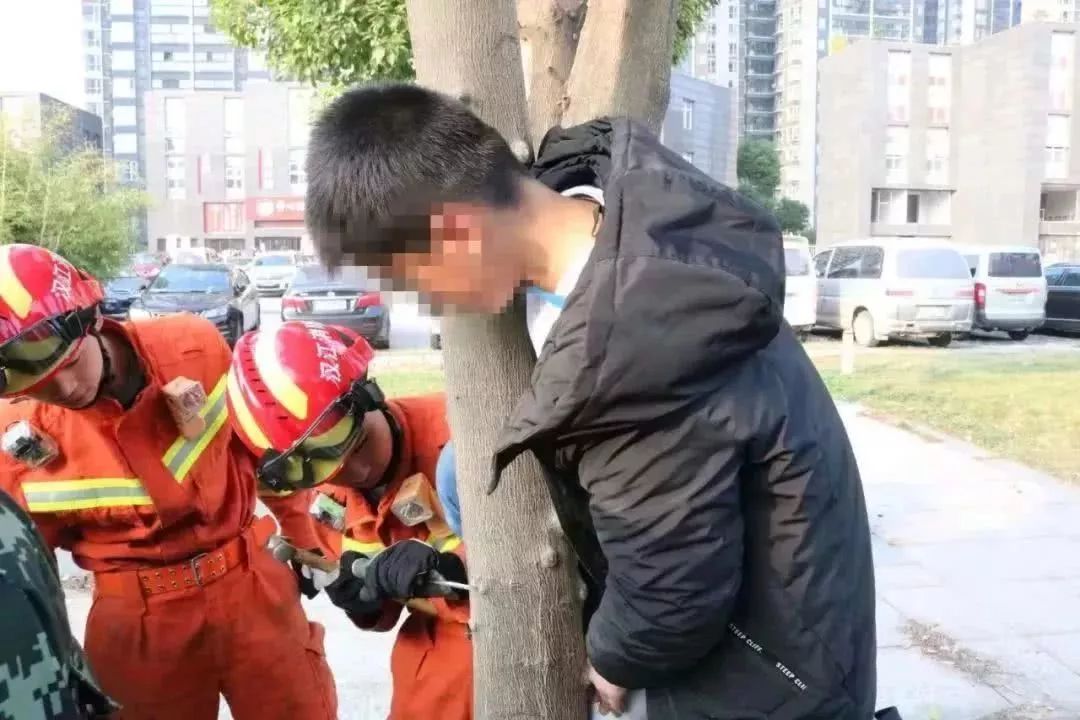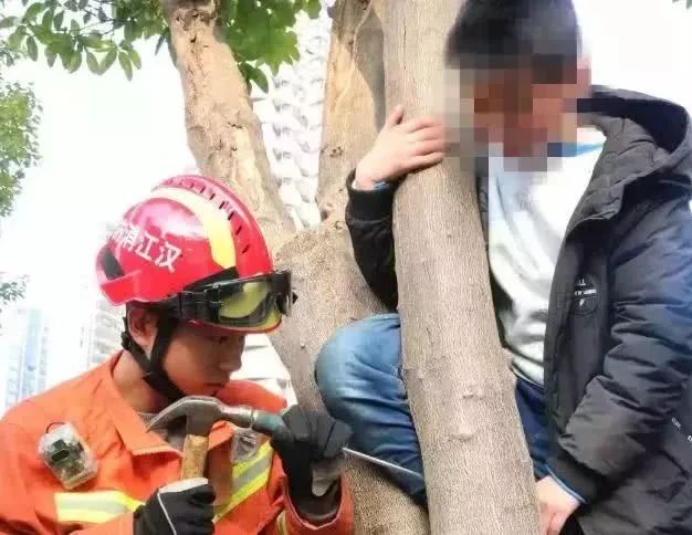 小伙子右腿進(jìn)了樹杈,