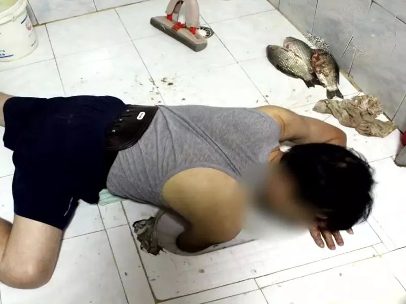 原來是他的魚跳到蹲坑里去了,