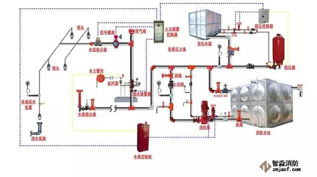 組成:①濕式報警閥②過濾器③延時器④壓力開關(guān)⑤水力警鈴⑥管網(wǎng)⑦水流指示器⑧噴頭