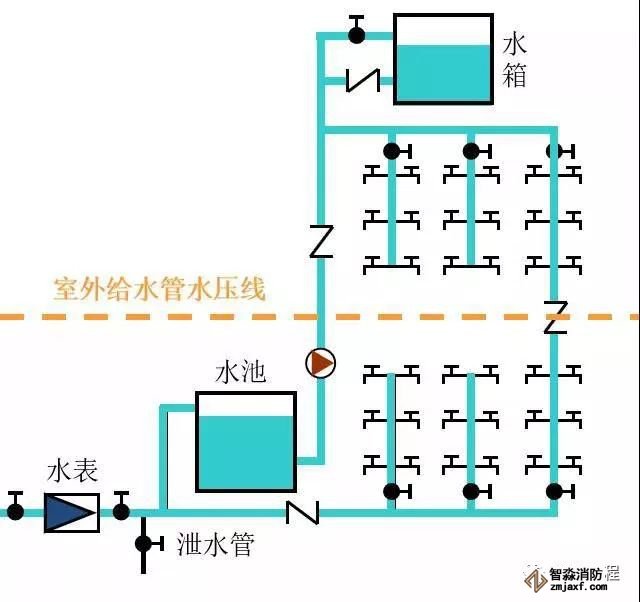 系統簡單,投資省,可充分利用外網水壓。但是一旦外網停水,室內立即斷水。