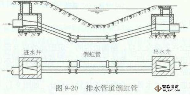 排水管道遇到河流、洼地、或地下構(gòu)筑物等障礙物時(shí),不能按原有的坡度埋設(shè),而是按凹的折線方式從障礙物下通過,這種管道稱為倒虹管。它由進(jìn)水井、下行管、平行管、上行管和出水井組成。