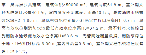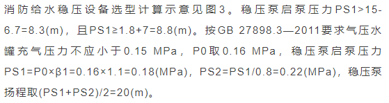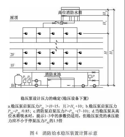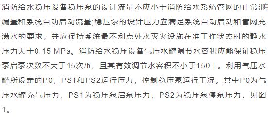 臨時高壓消防給水系統一般均應設置高位消防水箱(除符合規范規定可不設的情形外),且對其設置高度有一定要求。日本規范規定自動噴水滅火系統屋頂消防水箱最不利的最低供水壓力為0.15 MPa,美國、英國規范則要求0.10 MPa。我國1987年版和2006年版“建規”對比均沒有規定,只在條文中要求重力自流的消防水箱應設置在建筑的最高部位。1982年版《高層民用建筑設計規范》(以下簡稱“高規”)首次提出屋頂消防水箱應滿足最不利消火栓的靜水壓力,但沒有提出設計參數,1995年版“高規”做了具體規定。國標圖集98S205編制目的是為解決臨時高壓消防給水系統高位消防水箱設置高度滿足不了系統最不利點靜水壓力時應設增壓設施的要求,其為消防專用的增壓穩壓設備的主要功能只是火災初期時、消防主泵啟動前,確保具有足夠消防壓力的30 s儲水量進行初期火災撲救,直至消防主泵全負荷啟動運行。這里更多的還是強調增壓的概念,設備類似于氣壓供水,發揮主要作用的是氣壓水罐,穩壓水泵的作用是在3 min內,補足氣壓水罐內實際穩壓水容積。利用氣壓水罐所設定的P1、P2、PS1和PS2運行壓力來控制穩壓泵運行工況。P1為根據計算求得消火栓系統或自動噴水滅火系統中最不利點所需的消防壓力作為氣壓水罐的充氣壓力。平時管道系統如有滲漏泄壓等情況,控制穩壓水泵不斷補水穩壓,在PS1、PS2(啟動-停止)反復運行,一旦有火情,管道系統大量缺水,造成PS1下降(PS1→P2),降至P2時,立即啟動消防主泵。