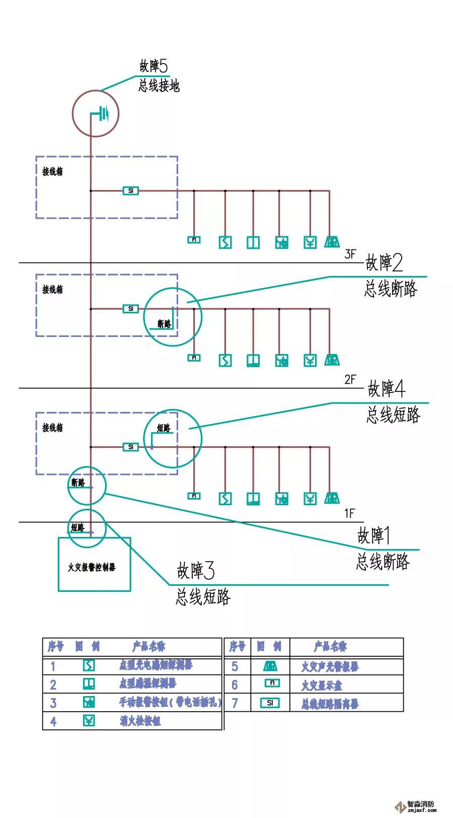 1報警控制器上顯示“總線故障”或“器件故障故障” 2 報警控制器上反復報出同一設備“器件故障” 3 現場設備指示燈全部熄滅 因總線接地時情況較復雜,現象可能是以上1種或幾種